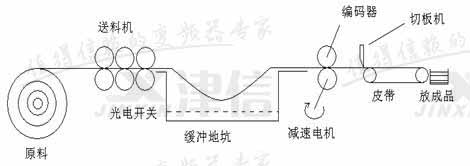 按上述工藝數據要求對這類控製係統進行設計並不困難,但由於傳統解決方案存在的缺陷,往往留下諸多遺憾。如對低端設備而言,傳統實現方法一般采用直流調速係統,實施方案的缺點是:係統笨重、耗電量大、調試複雜、維護成本高;在定位控製方式方麵,一般采用讀取行程開關信號後通過預減速配合氣壓製動的定位方式, 剪切效率很低, 誤差較大。而對高端設備,一般采用直流伺服技術,雖然精度和效率得以保證,但價格非常昂貴,產品性能價格比難以令人滿意。